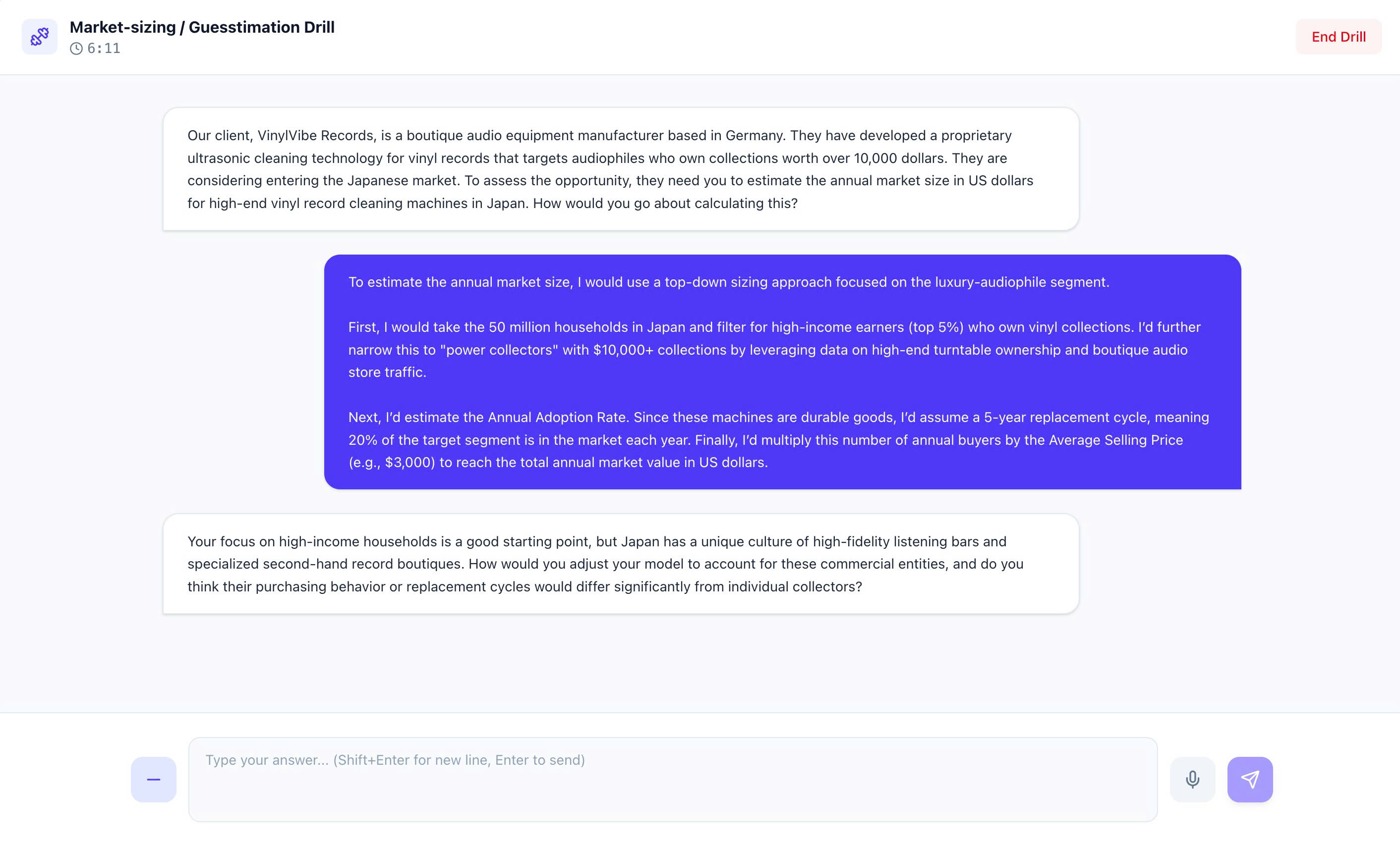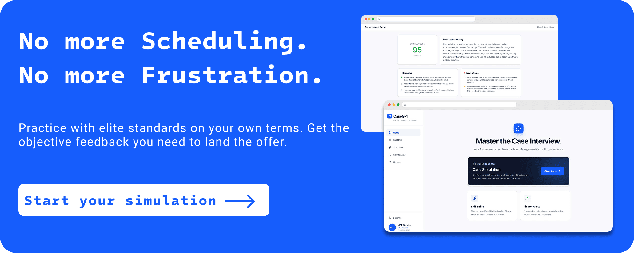 Practice as many cases as you need, whenever you want. Get objective feedback, sharpen your math, and get offer-ready.